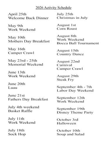 All rentals must be made by a member in good standing. The member must be in the park when their guests are in the park, they must read and complete a rental agreement, and reservations can be made in the office. Both sides sleep 4-6 people. There is a queen size and 2 twin size beds per side. It’s the member’s and or guests responsibility to bring bedding and to clean and remove trash after use. A board member will do a walk through upon check in and before check out with the member.